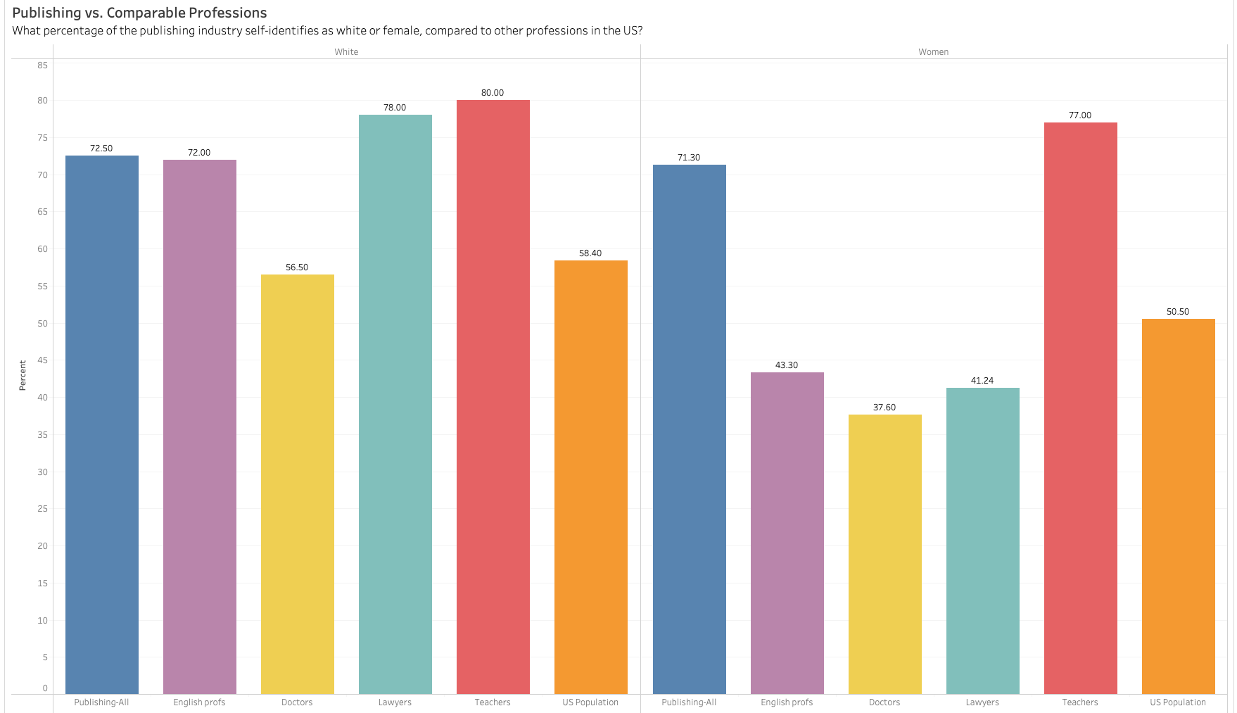 At this point, you may be asking: OK, but isn’t this simply a problem for any profession that requires a high level of literacy, a 4-year degree, or (often) a graduate degree? Great question. Turns out, most fields that meet these criteria are also interested in their demographic makeup and better reflecting the US population. I compared the makeup of publishing to a few relevant professions: law, English professors, and public school teachers. For fun, I added in doctors. What percentage of the publishing industry self-identifies as white, compared to relevant professions?6