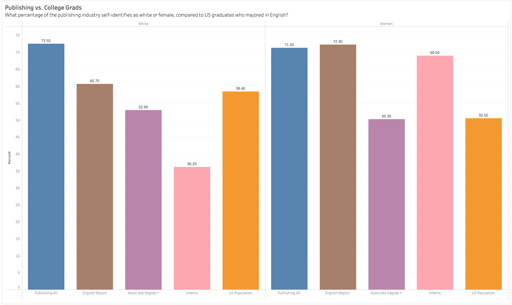 Holding a college degree may mean that you are eligible to work in publishing, but it doesn’t mean you are likely. I genuinely doubt that pre-Med majors are enrolling in the Columbia Publishing Course or that rising seniors in Physics are trying to intern PRH. Instead, we can get a better picture by turning to the industry’s largest feeder major: English. What percentage of the publishing industry self-identifies as white, compared to US college graduates with degrees in English Literature?5 This is where, for this English prof, things get interesting.