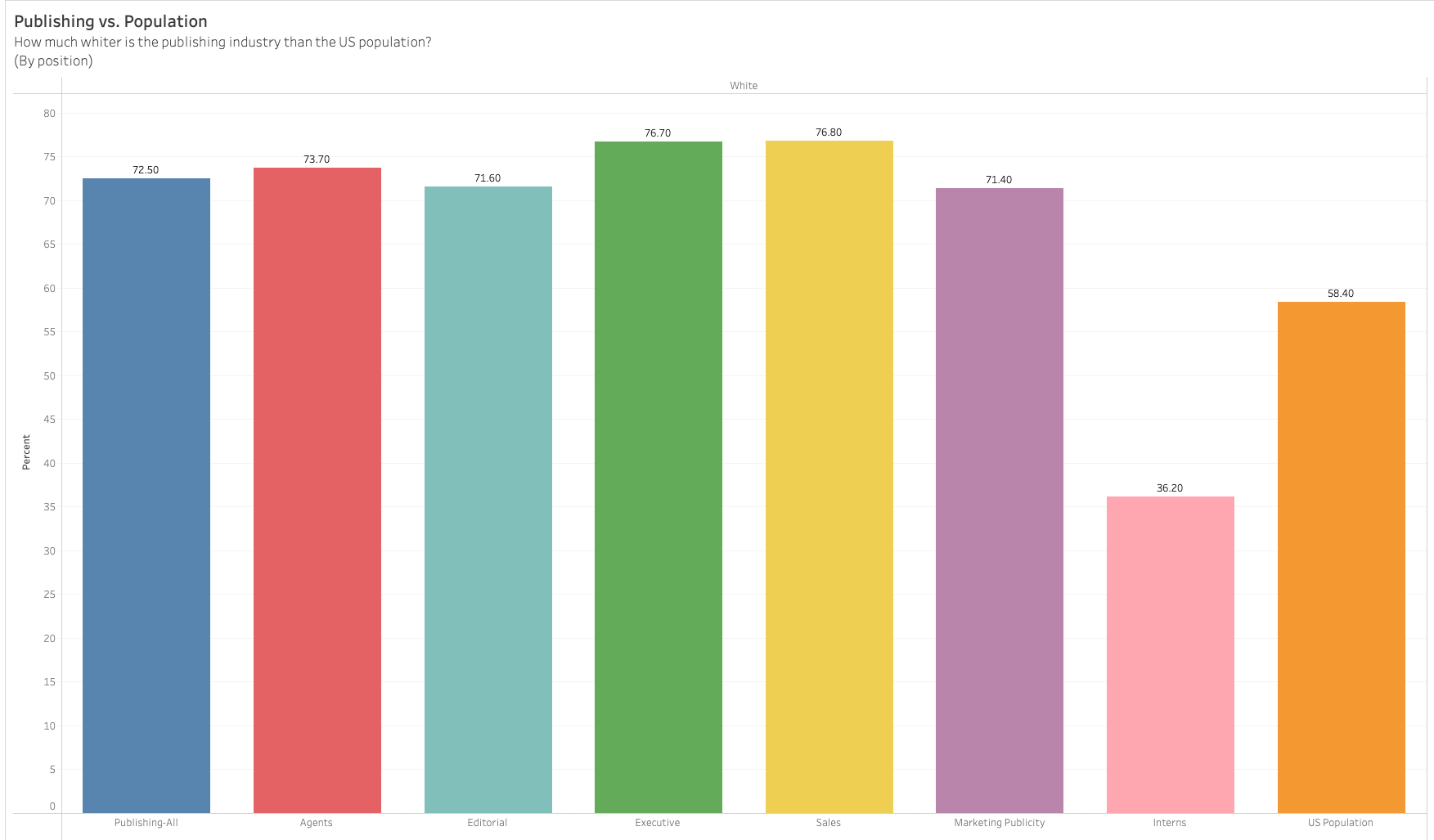 To start, I’m using the most recent Lee & Low Diversity Baseline 3.0 statistics on publishing industry demographics. I opted to use Lee & Low instead of the PW Salary Survey because it surveys a wider group of publishing professionals and because of the larger sample size. For the US Population, I relied on the US Census Bureau. Other relevant data sources noted below.