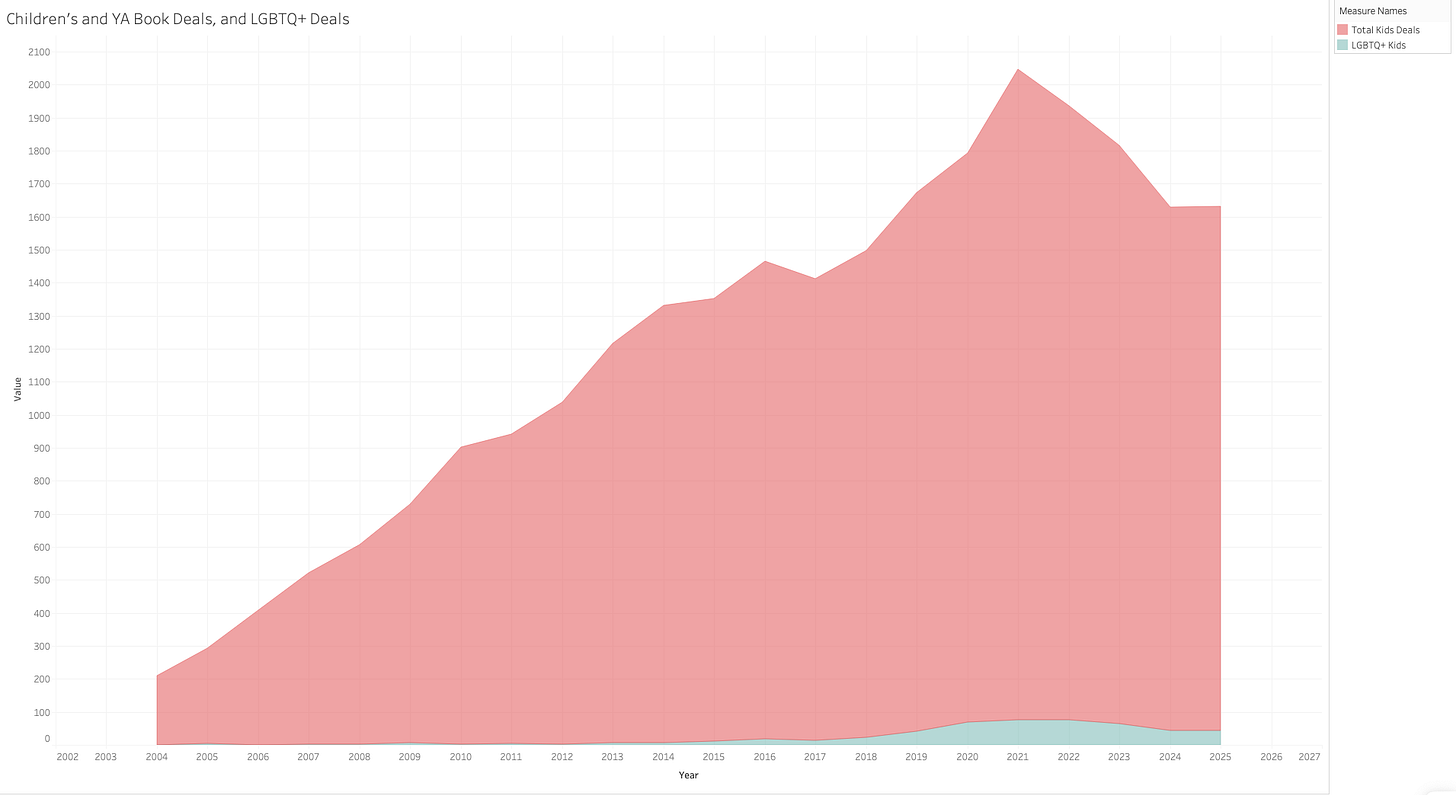 See that little blue shaded area, at the bottom? That vanishingly small area that you may need to squint to see? That represents the number of book deals about LGBTQ+ children or young adults that have been published each year.