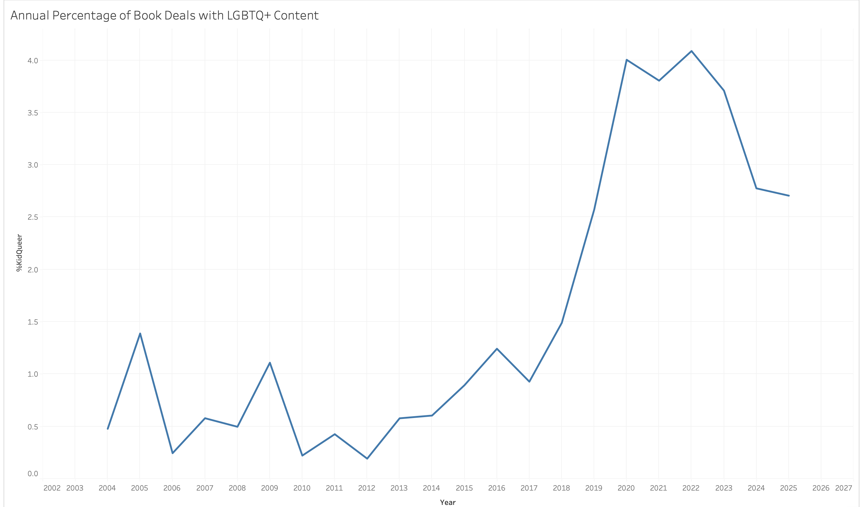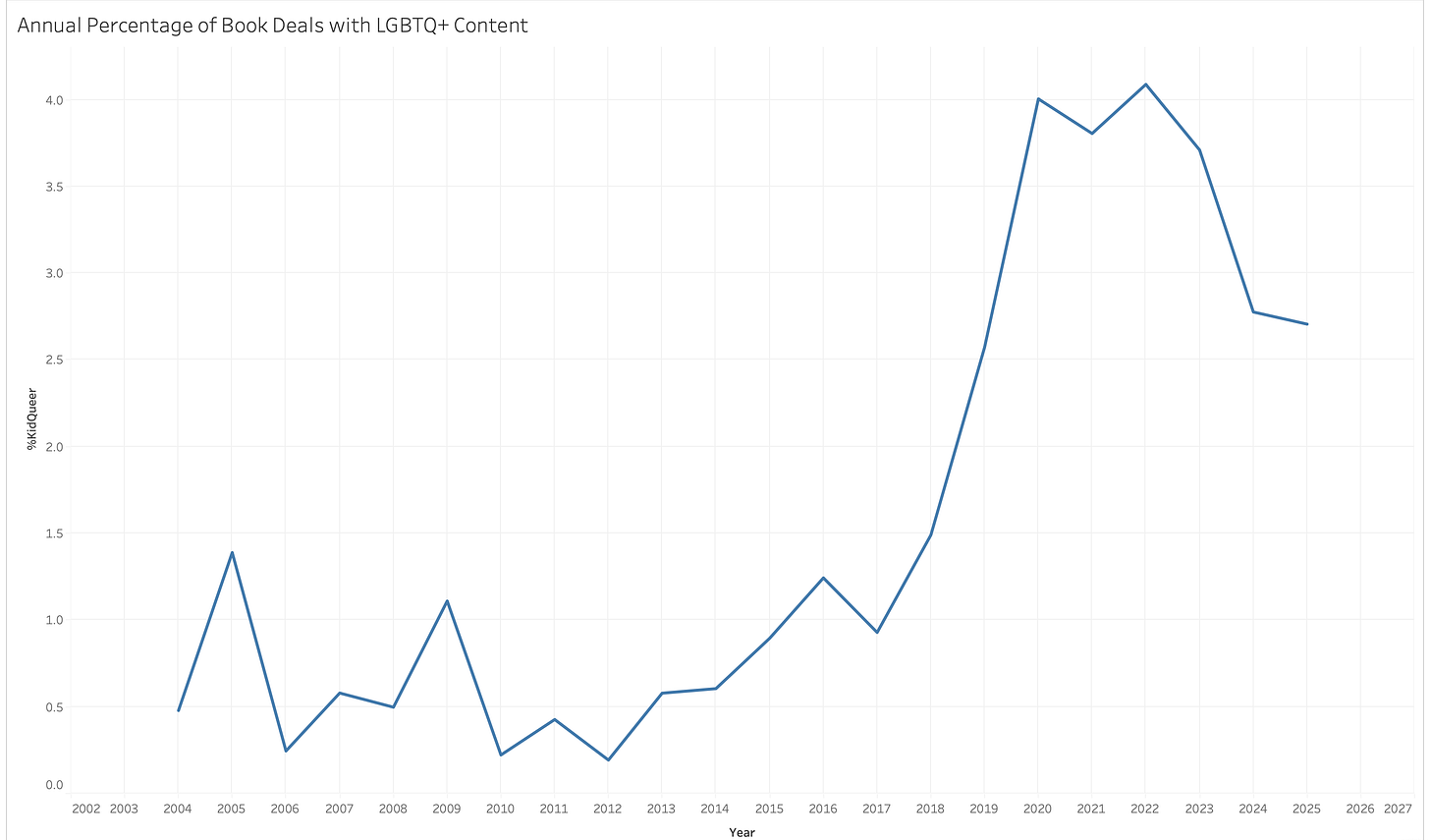 Interestingly, we don’t see a comparable decrease in the Adult LGBTQ+ market. There has been greater variation in the Adult market, but likewise, we see a flourishing beginning around 2019 that remains consistent. LGBTQ+ Adult deals actually haven’t decreased, in terms of a percentage of total deals, since 2024. In other words, this phenomenon does seem to be localized in Children’s/YA. It’s not just Trump, in other words, as much as the combination of Trump plus book bans. There may be good incentive for YA authors to recategorize some of their books as “New Adult,” rather than risk this challenging market (and, incidentally, PM counts “New Adult” amongst Adult Fiction rather than Children’s), which would partly create this effect in the data.